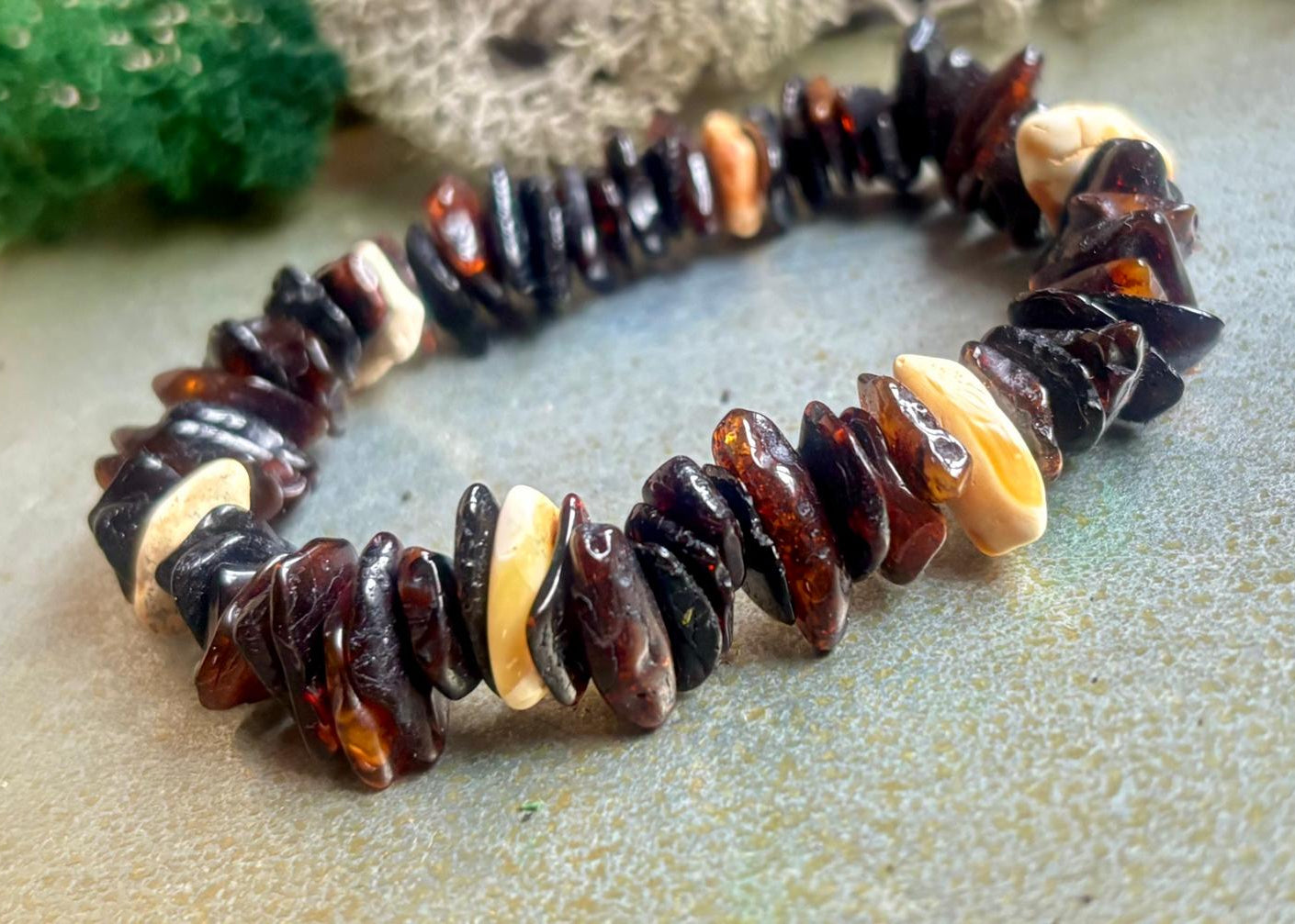 Authentisches Armband aus baltischem Rohbernstein in zwei kontrastreichen Farben – tiefes Kirschrot und natürliches Weiß. Jedes Stück ist handgefertigt und zeigt die natürliche Schönheit polierter Rohbernsteine. Das flexible Band passt sich komfortabel jedem Handgelenk an und eignet sich perfekt als persönliches Accessoire oder durchdachtes Geschenk. Ein zeitloses Stück mit natürlicher Eleganz.