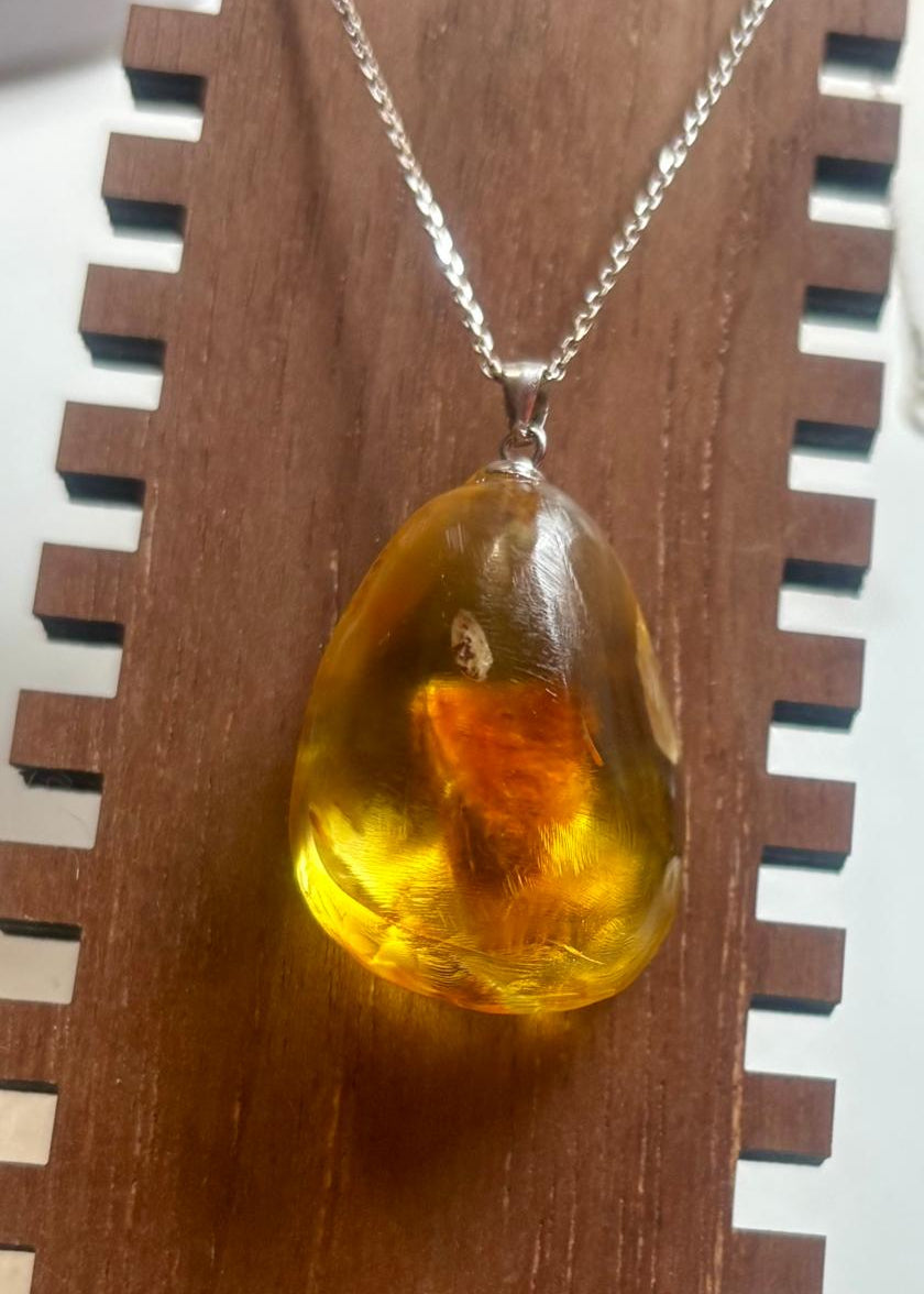 Kostbarer Bernsteinanhänger in klassischer Eiform mit natürlichem Loch an der Rückseite. Das hellhonigfarbene, durchscheinende Bernstein besticht durch sein seltenes, mittig angeordnetes Muster und wird von einer eleganten 925er Silberöse ergänzt. Handwerklich gefertigt und vielseitig – als Geschenk, Schutzstein oder Alltagsschmuck gleichermaßen geeignet. Ohne Kette.