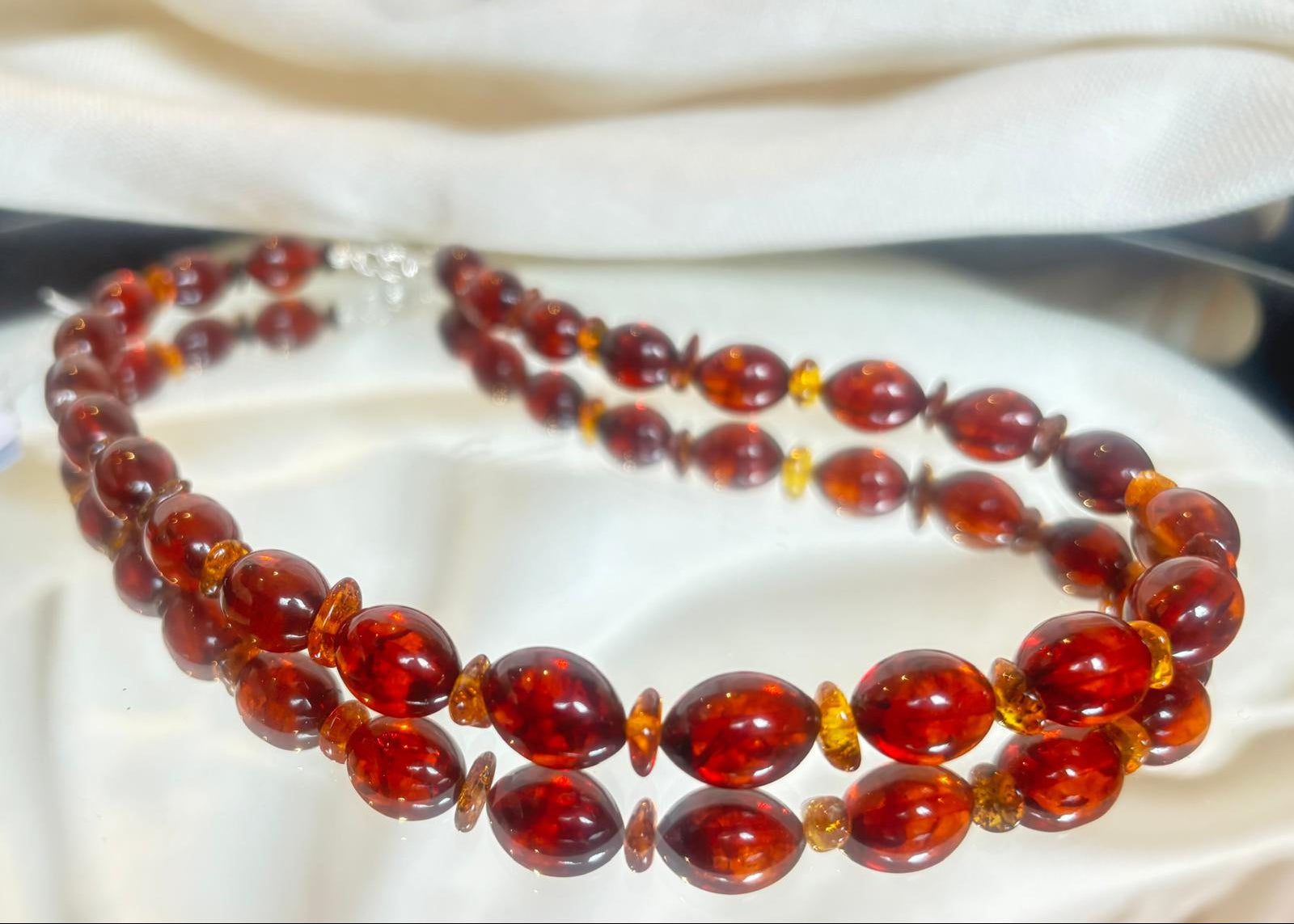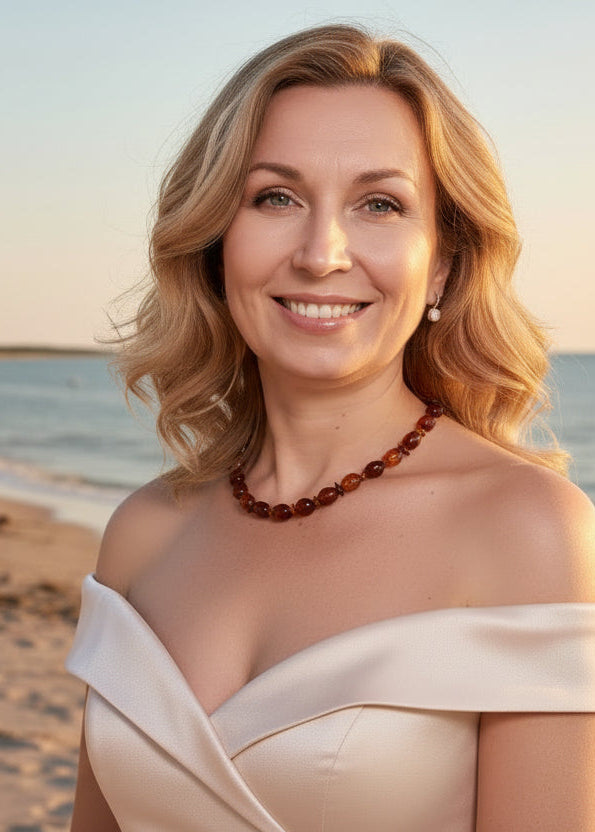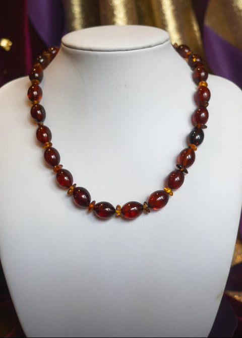 Erlebe die Magie dieser handgefertigten Bernsteinkette mit authentischem, leuchtendem Naturstein in tiefem Kirschrot. Die sanfte Pflaumenform wird durch zarte Cognac-Nuancen veredelt – eine harmonische Komposition, die Wärme und Eleganz ausstrahlt. Diese einzigartige Kette besticht durch ihre natürliche Schönheit und passt zu jeder Persönlichkeit und jedem Alter. Ein zeitloses Schmuckstück, das sich auch als durchdachtes Geschenk perfekt eignet. Hochwertiger 925er Silberverschluss. Jedes Stück ein Unikat aus Handarbeit.