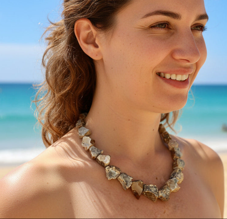 Elegante Bernsteinkette aus authentischem Baltischem Bernstein in natürlicher, unpolierter Form. Die rohen Bernsteinstücke schaffen eine moderne Marmoroptik mit strukturierter Oberfläche. Praktischer Kunststoffverschluss für einfaches An- und Ausziehen. Ein zeitloses Accessoire mit nordischem Charakter – perfekt als Geschenk oder für den eigenen Stil.