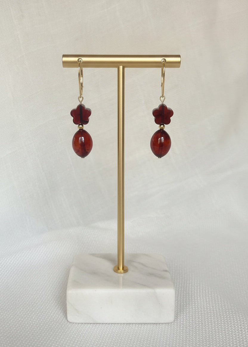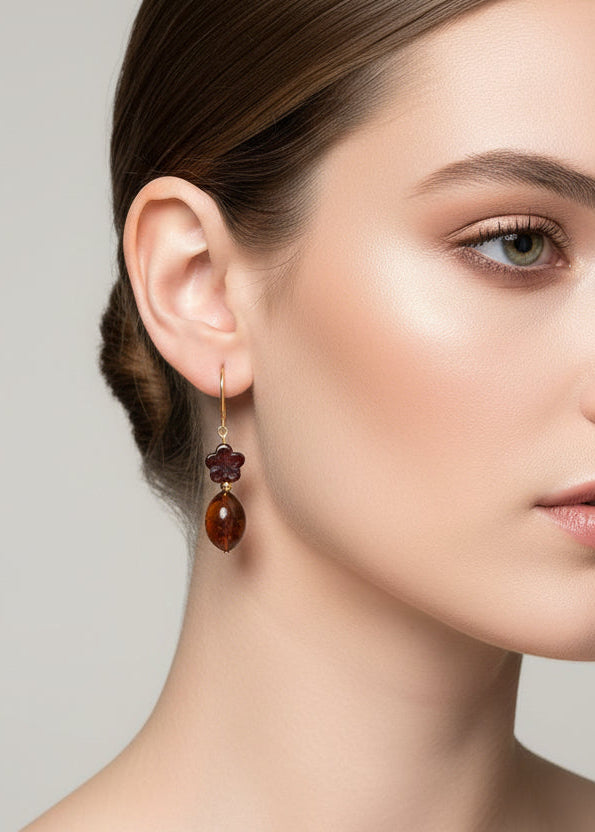 Lassen Sie sich von diesen bezaubernden Ohrringen verzaubern: Authentischer baltischer Bernstein in sattem Kirschrot mit herrlicher Transparenz trifft auf kunstvolle Verarbeitung. Das doppelte Steindesign mit modernem Blütenschliff und ovalen Pflaumenformen schafft eine einzigartige Ästhetik. Veredelt mit vergoldetem 925er Silber und elegantem englischen Verschluss – ein Statement-Piece für Frauen mit Geschmack und Stilbewusstsein, die Natur und Handwerk lieben.