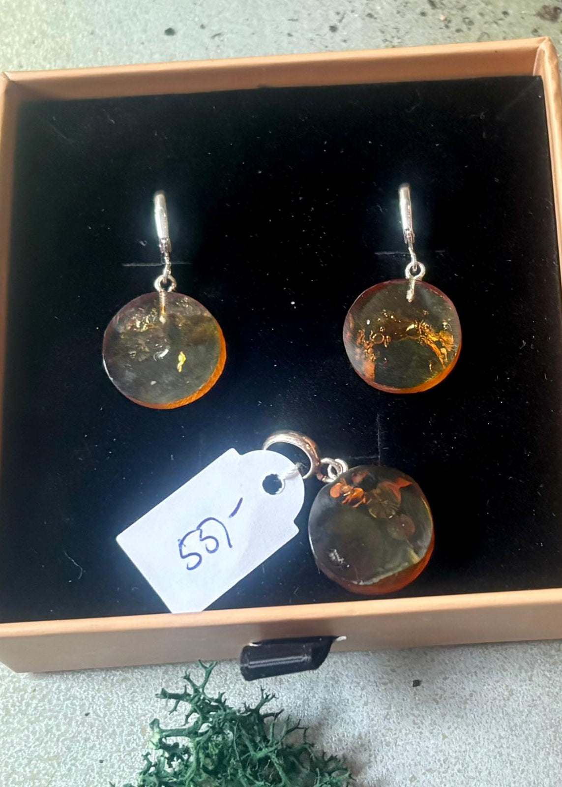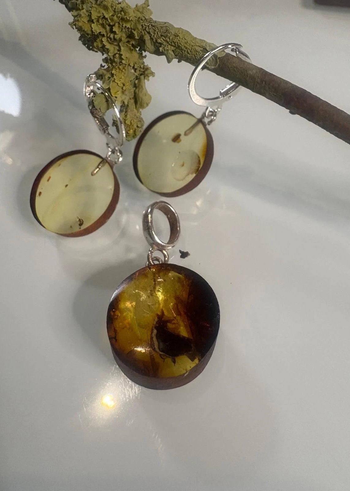 Handgearbeitete Ohrringe und Anhänger im Set aus Naturbernstein