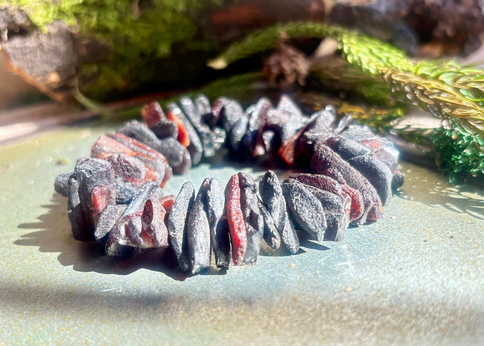 Massives Bernstein-Armband in tiefem Schwarz – das Statement-Stück für moderne Stilbewusste. Echter Naturbernstein, einmalig thermisch veredelt zu intensivem Schwarz mit faszinierenden dunkelroten Reflexen im Gegenlicht. Die raue, unpolierte Oberfläche unterstreicht die authentische Rohheit und verleiht dem Armband seinen charaktervollen, urbanen Charakter. Federleicht und angenehm zu tragen – perfekt für jeden Tag und jeden Anlass. Das massive Design passt zu modernen Outfits und betont Ihren individuellen, zeitgemäßen Stil. Eine attraktive Alternative zum klassischen Honig-Bernstein – für Damen, Herren und Kinder, die Natur und Moderne vereinen möchten.