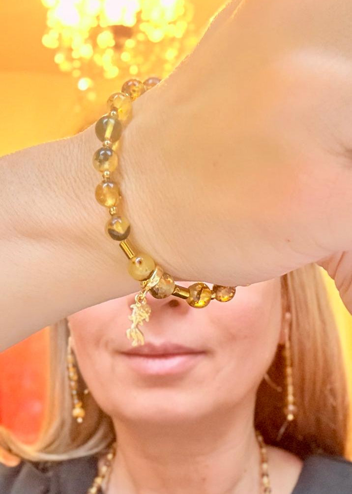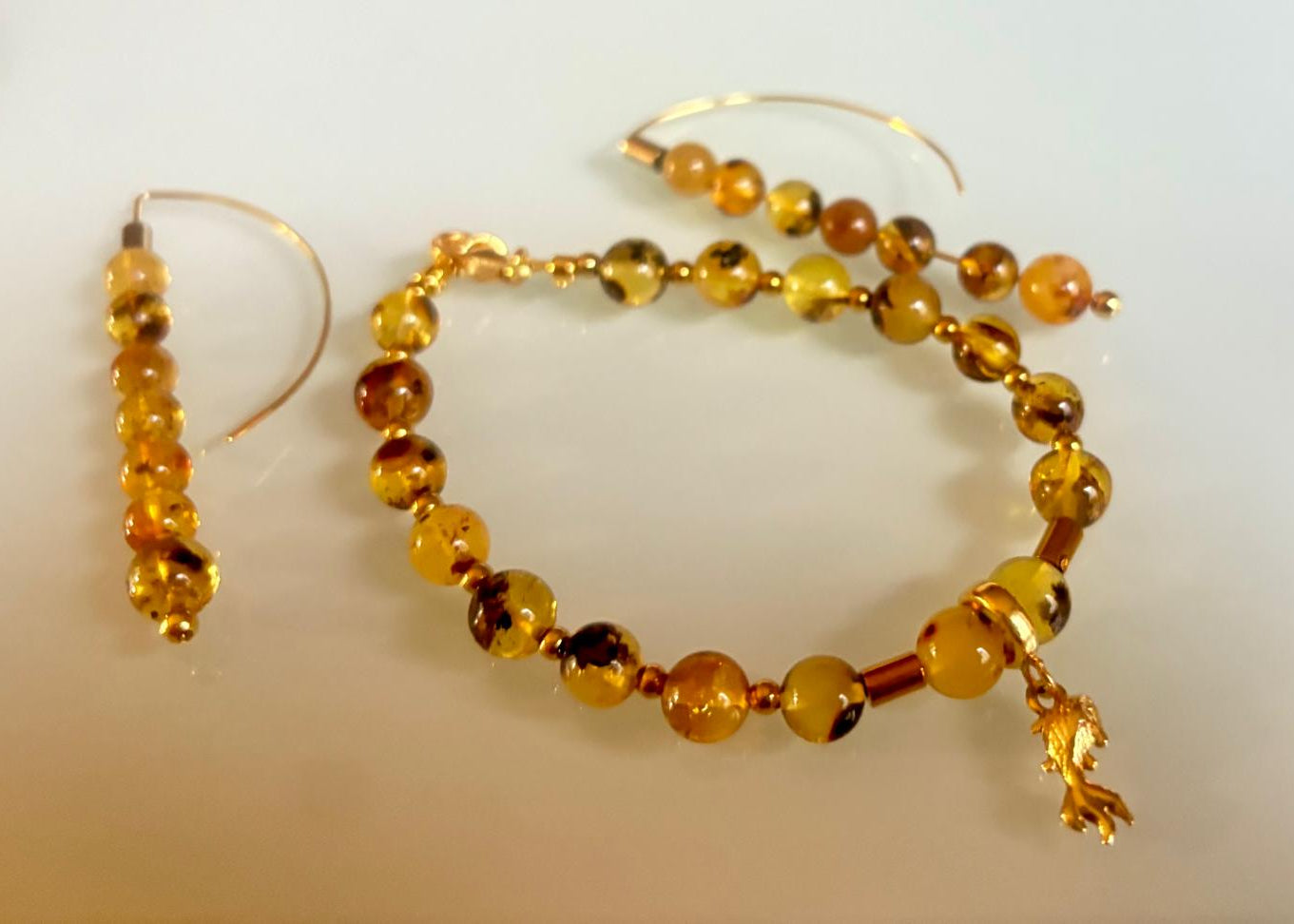 Erleben Sie die Magie natürlicher Bernsteine in diesem exklusiven Damen-Set. Wunderschöne transparente Kugeln in Grün-, Gelb- und Brauntönen bilden einen subtilen Farbverlauf, der Eleganz ausstrahlt. Veredelt mit vergoldetem 925er Silber und funkelnden Hämatit-Details entsteht ein harmonisches Gesamtbild. Die stabilen Verschlüsse halten sicher, während der verspielte Goldfisch-Anhänger dem Armband einen modernen Charakter verleiht. Angenehm leicht und komfortabel für den täglichen Gebrauch. Jedes Stück ist handwerklich gefertigt und ein echtes Unikat – zeitlos schön und voller Persönlichkeit.